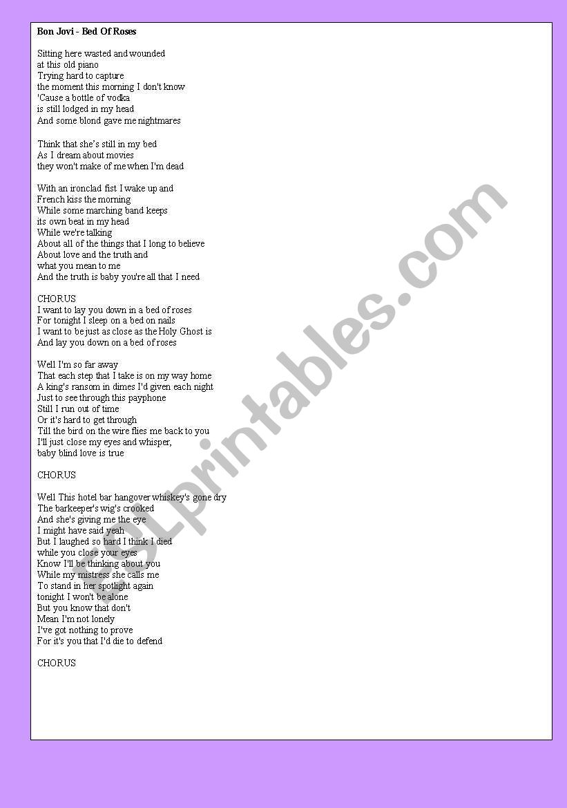 Bon Jovi Bed Of Roses Song Lyrics Vinyl Wall Art Vinyl Etsy from i.etsystatic.com And from the song's chorus, what he is hoping he can do for her is to lay her down in a bed of roses despite the fact that he currently sleeps on a bed of nails. We have an official bed of roses tab made by ug professional guitarists. Dm dm i wanna lay c bb f you down in a bed of roses dm dm for tonight c bb f i sleep on a bed of nails bb oh, i want to be f just as close as bb f the holy ghost is dm c bb bb and lay you down bb bb f c on a bed of roses bridge: Sitting here wasted and wounded at this old piano trying hard to cap Be the first one to write a review. Laying her down on a rose laden bed is apparently a metaphor for how much he wants to take care of her and make her happy. The song contains drawn out guitar riffs. About f love, the truth, what you mean to me.